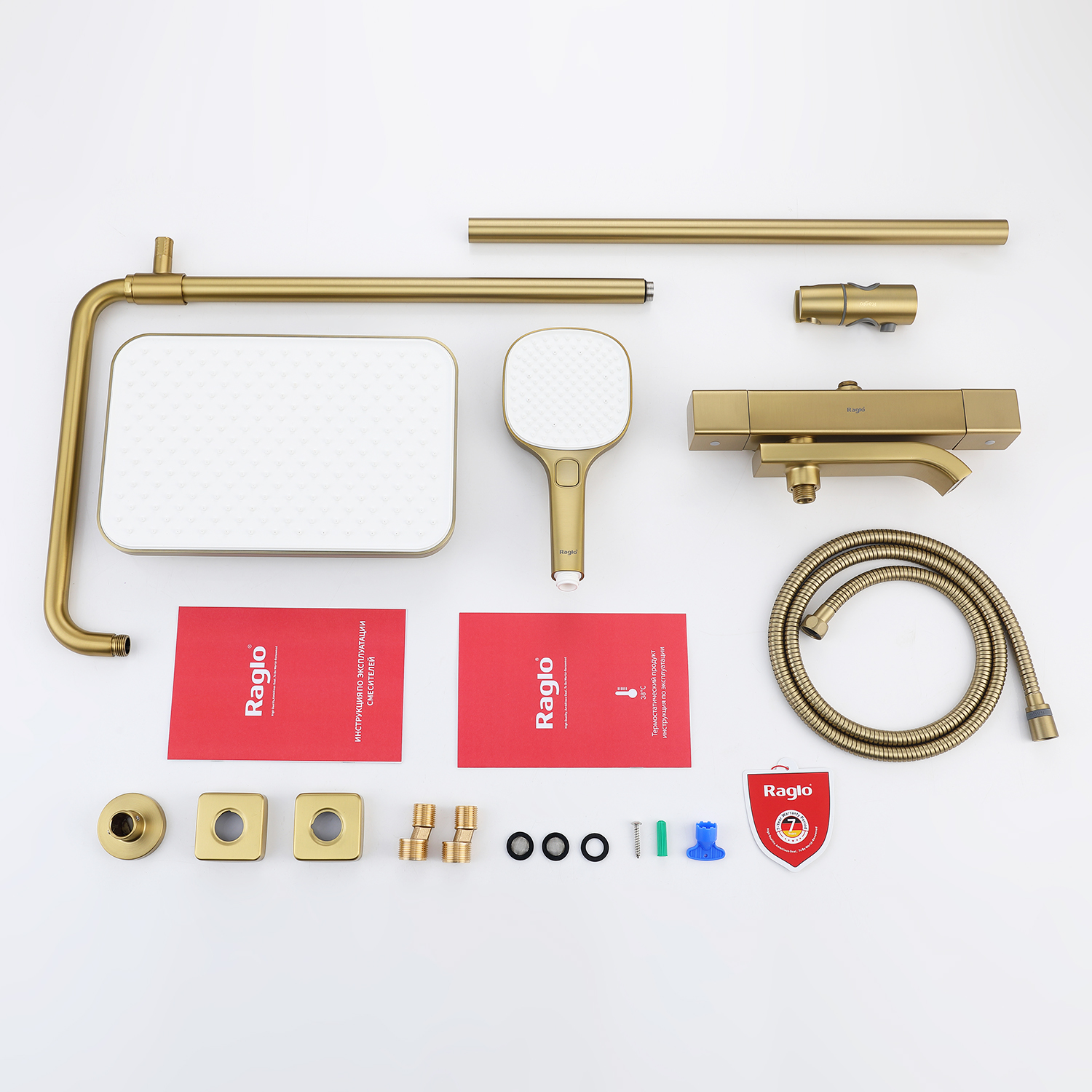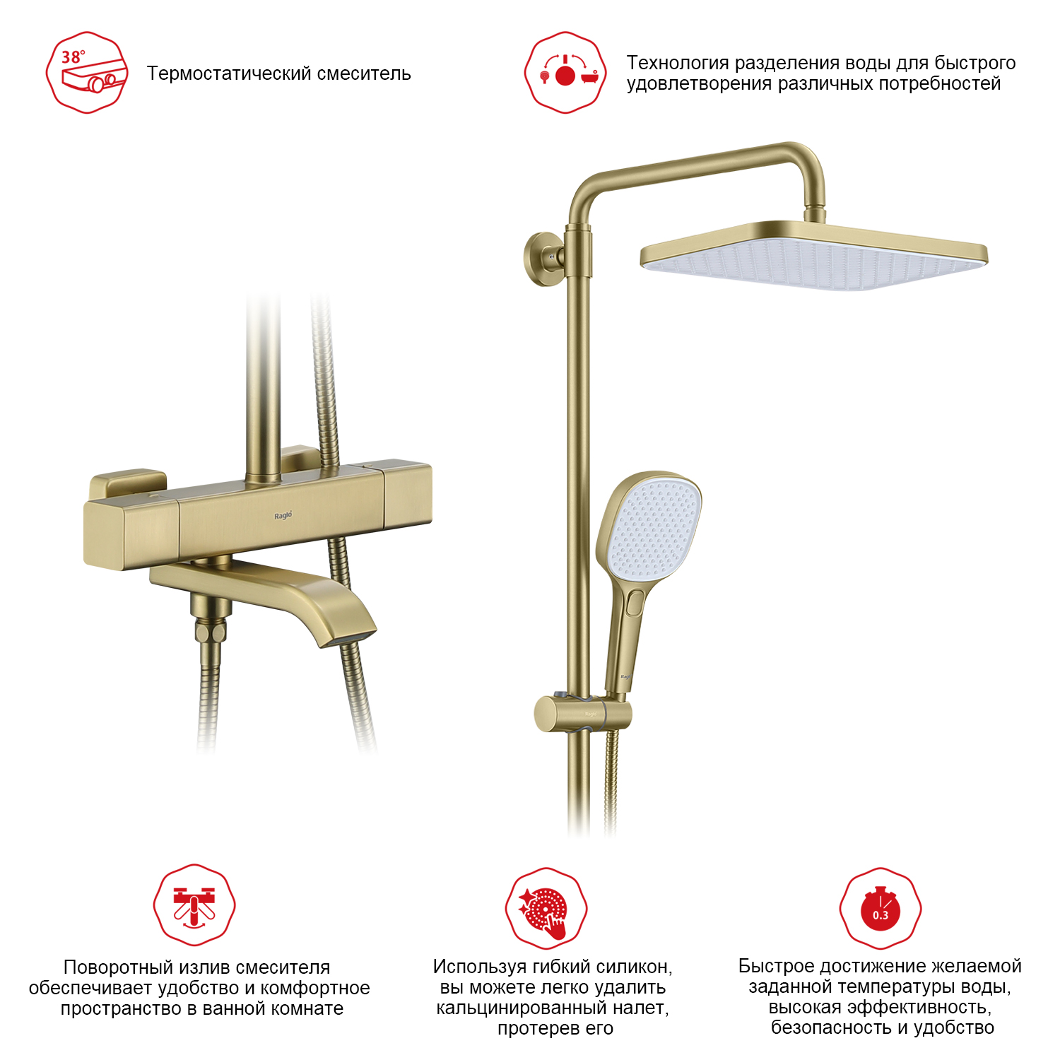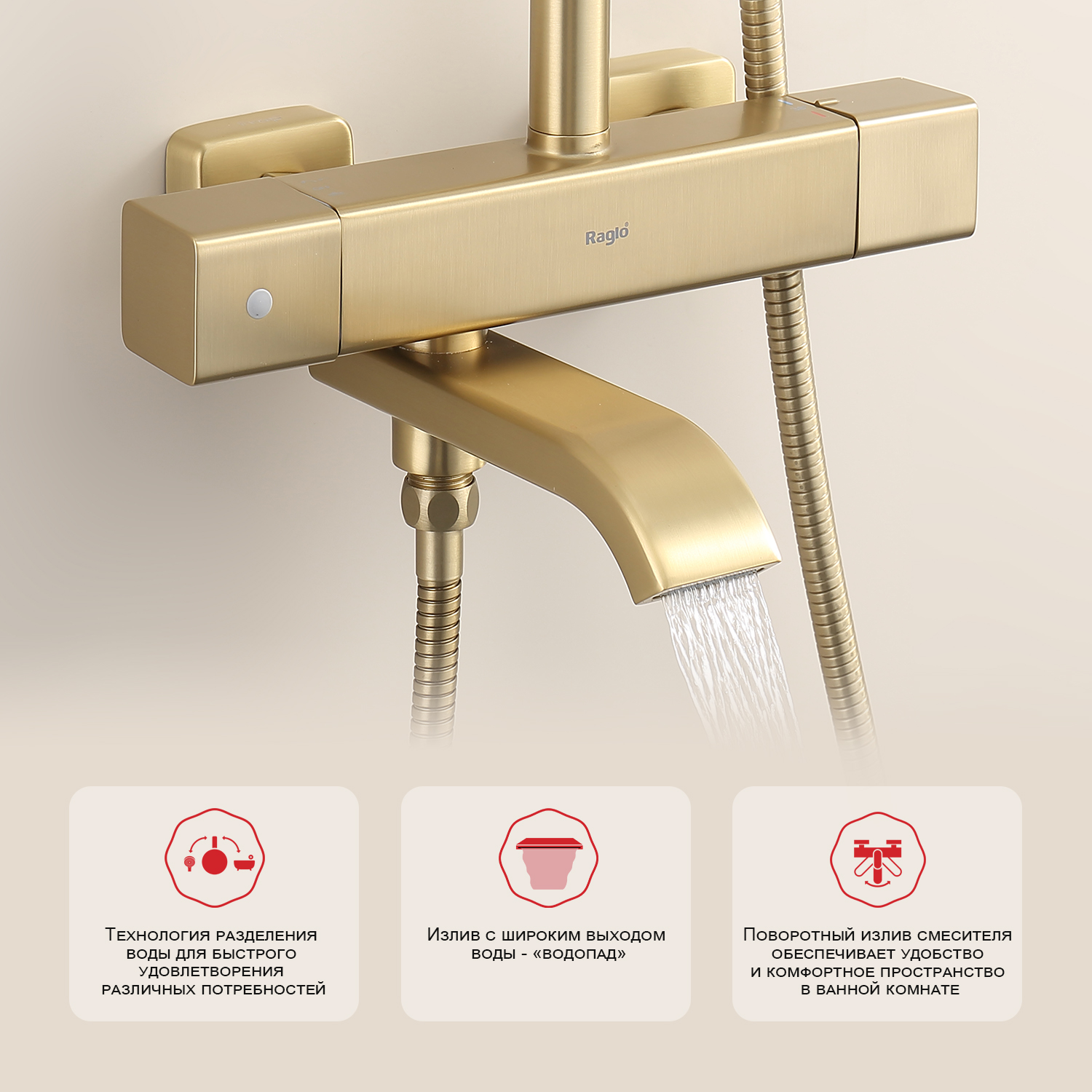 • Душевая система для ванны с термостатом Сатин Золотой Raglo