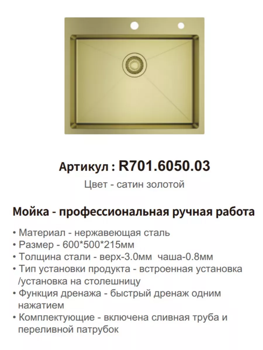 Кухонная мойка Raglo R700.6050.03, 50 см, нержавеющая сталь, цвет золотой сатин